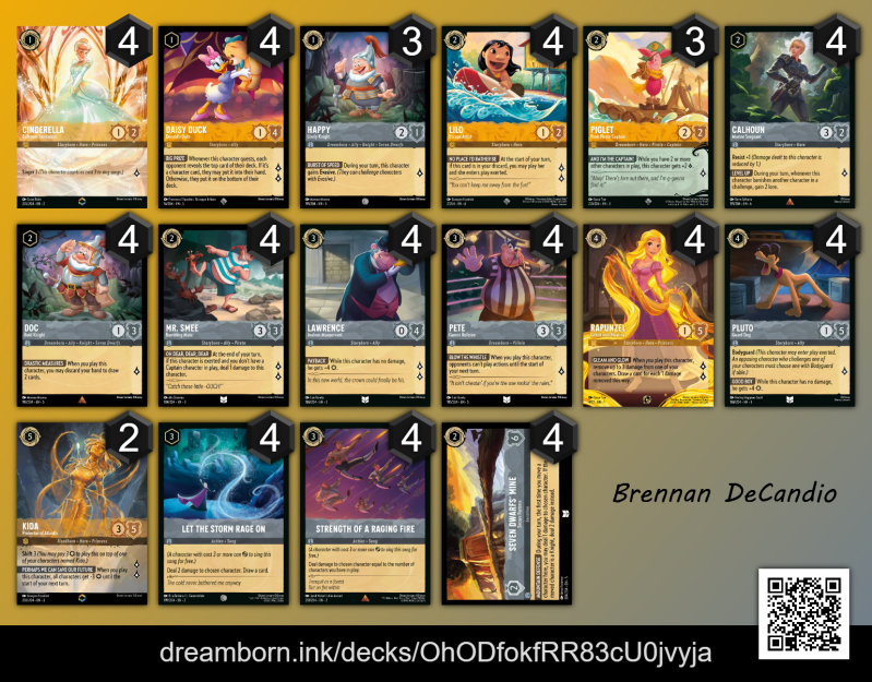 Brennan DeCandio hat fast vollständig den Songweg verlassen und hat klassische Steelsong Karten wie "Ariel - Spektakuläre Sängerin" und "Ein Traum wird wahr" gleich ganz gecuttet. Wir sehen hier ebenfalls einen sehr aggressiven Ansatz mit wiederkehrenden Effekten wie der Lilo oder aber auch dem Schadenspotential der Mine. Die beiden Zwerge Happy und Chef, die auch als Ritter zählen, sind sogar in der Lage den Effekt der Mine auszureizen. Sergeant Calhoun ist eine sehr starke Ergänzung aus Set 6, die gleichzeitig Boardkontrolle erringen und den Lorecount voranbringen kann. Pluto hat als starker undercostet Bodyguard auch hier den Weg ins Deck gefunden, um die aggressiven kleinen Quester zu beschützen und stellt mit seinen 5 Willenskraft auch ein prädestiniertes Ziel für Rapunzel dar - ganz ähnlich der Liste von Zach Bivens. Bei der flachen Tintenkurve dürfte die Hand oft genug leer sein, sodass Chef nachteilslos Value erzeugt. Wenn man aggressiv Steelsong spielen will, gefällt mir die Liste von Brennan DeCandio etwas besser als die von Zach Bivens, da hier weitestgehend auf schwächere Füllkarten verzichtet wurde und sie insgesamt daher schlüssiger aussieht.